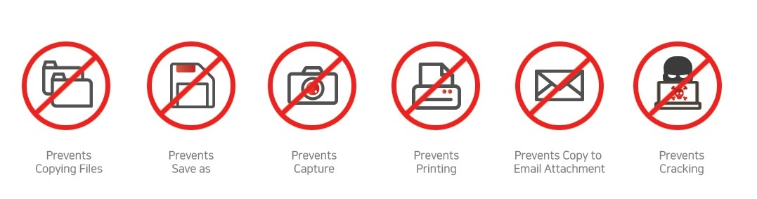 프린터 및 가상 프린터 차단, 다른 이름으로 저장 방지, 전자 우편 기능 차단, 캡쳐 및 녹화 차단 등 다양한 보안 옵션을 제공하여 암호화 된 데이터 파일 이용 중 파일이 유출될 수 있는 경로를 철저히 차단합니다.